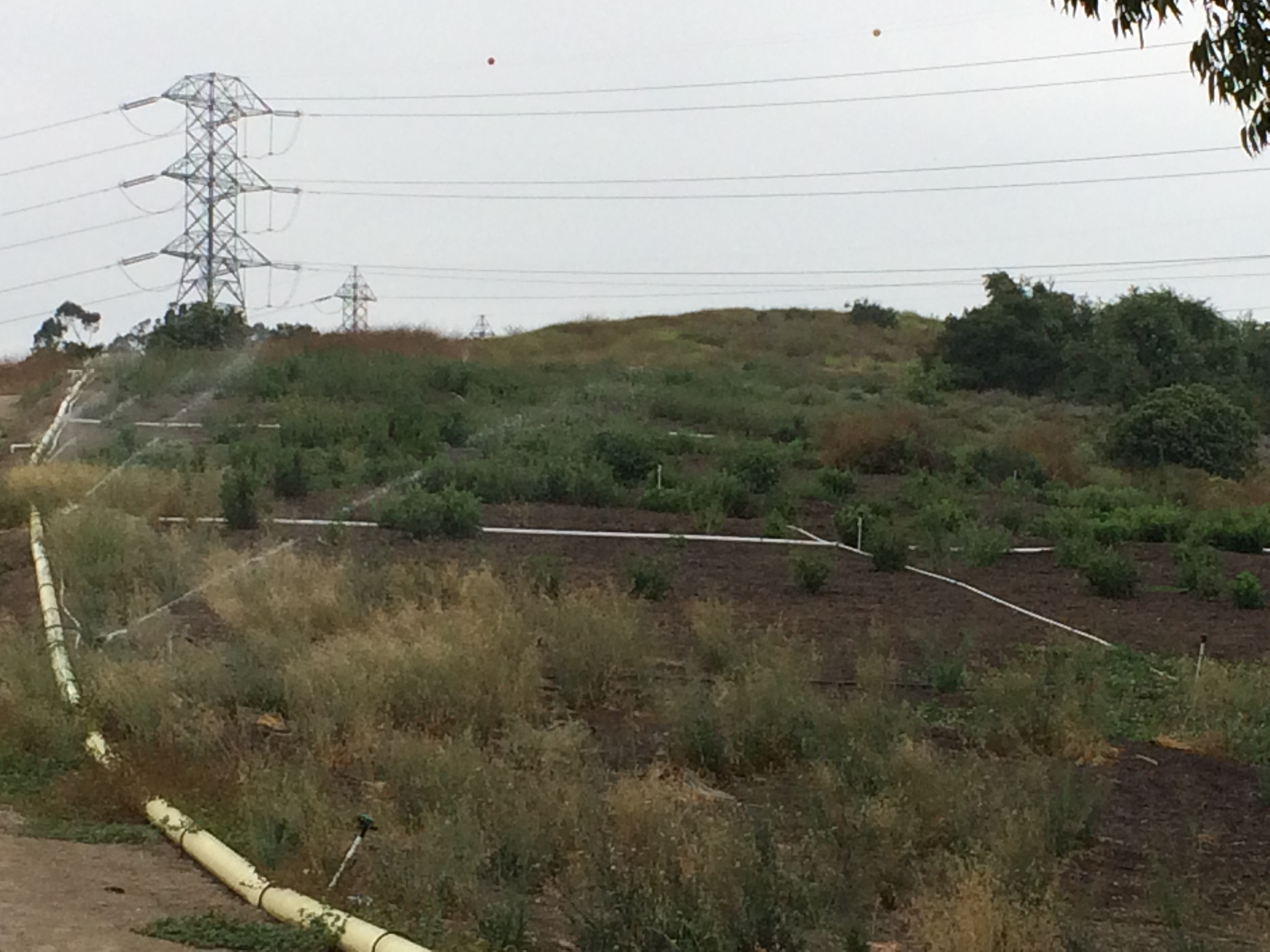 A lot of work is occurring in Powder Canyon! To initiate our restoration project, goats did a great job clearing the site of nonnative vegetation in the fall of 2016. When visiting Powder Canyon , you may notice the above-ground yellow/white irrigation pipes that have been installed throughout the 60-acre site. The irrigation is currently being used to stimulate weed growth that will be eliminated/killed using herbicide in a series of “grow-kill” events throughout the next year. A second year of grow-kill will likely be necessary in the coastal sage scrub habitat restoration sites due to the high amount of weeds in those areas. Additionally, three hundred and sixty (360) oak trees have been planted and root guards have been, and continue to be, installed for the additional oaks/walnuts. Irrigation is also being used to water the oak trees and will be used in the future in all areas once hydroseeding occurs and additional trees/shrubs are planted.