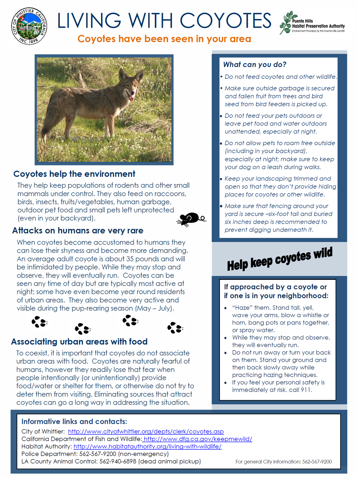 When residents living in communities surrounding natural areas (such as the Puente Hills) get coyotes in their neighborhoods, their first thought typically is that the coyotes are “coming down from the hills”. Although many coyotes do enter suburban areas from natural areas looking for food, many coyotes found in suburban areas are year-round residents, including very urban neighborhoods with essentially no natural areas. Through the illegal feeding of coyotes, and/or lack of deterrent measures to discourage coyotes from entering residential areas, humans find coyotes amongst them. Coyotes naturally are found where the food is, and if attractants (like outside pet food and water, rodents, or free roaming house cats) are present, coyotes may be present as well.